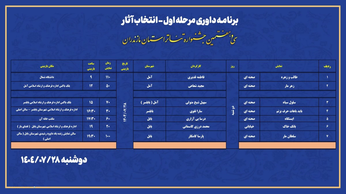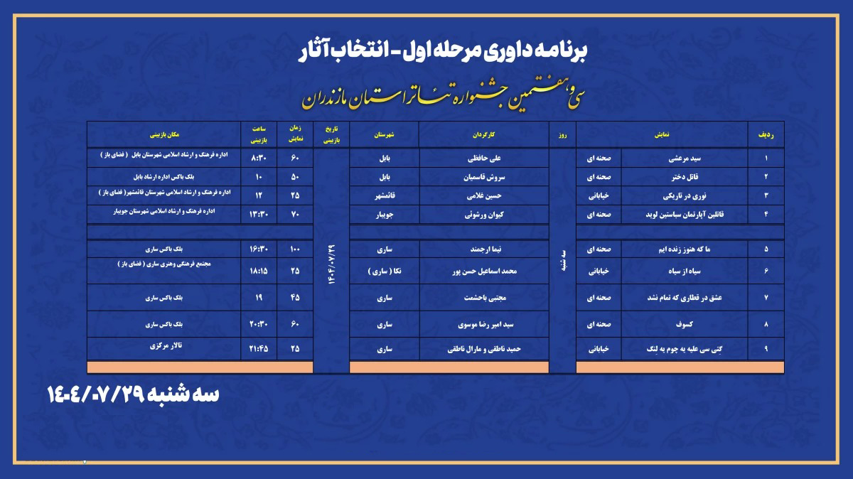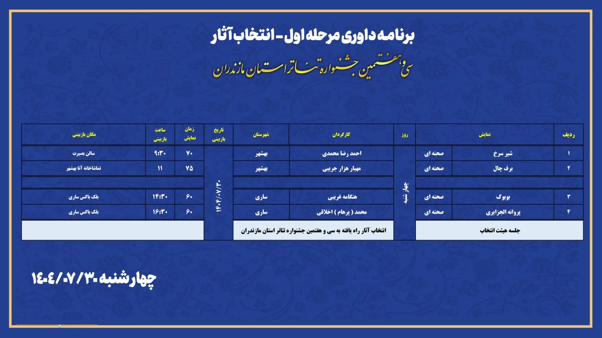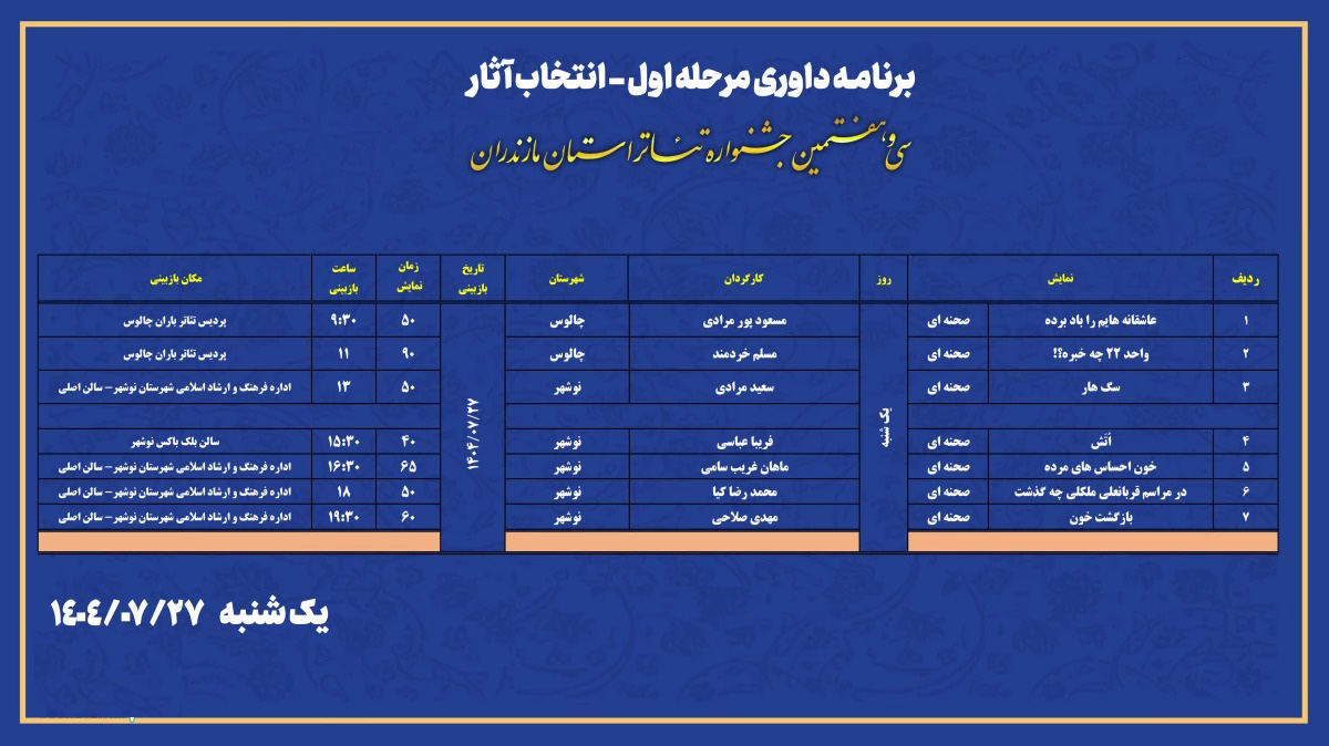 با اتمام مهلت ثبت نام گروه‌های نمایش در سی و هفتمین جشنواره تئاتر استان مازندران و پس از برنامه ریزی جدول بازبینی و انتخاب آثار این دوره از جشنواره منتشر شد.